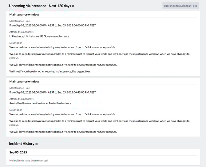 Learn how to check on the uptime status and maintenance schedule of your 6clicks services