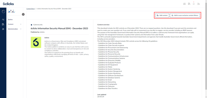 As Partners, your clients do not have visibility to the full 6clicks Content Library and will only have visibility of the content you add to their Spokes. Learn more about managing your Exclusive Content Library as a 6clicks Partner. If you want to disable this feature and make all 6clicks content visible to your clients, contact 6clicks support.
