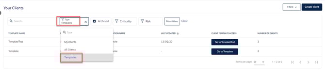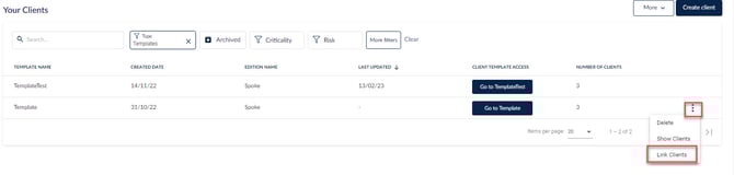 Once filtered to templates, click the three dots icon at the right-hand side of your selected template for options and select Link Clients.