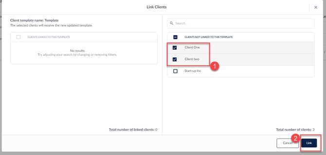 From this menu choose which clients will receive the template, select the clients that will receive the template (1) and then select Link (2).