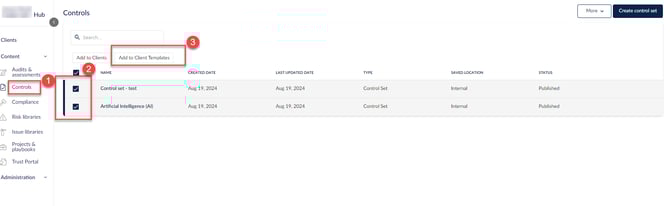 To do this navigate to the content type you wish to add from the Hub for this demonstration we will be using Controls (1) then select all the control sets you wish to add using the check-box on the left side of the screen (2). For this demonstration we will be adding all the control sets. Then click Add to Client Templates (3).