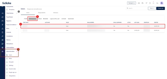 لتغيير هذه الأذونات لمستخدم فردي، انتقل إلى الإدارة > المستخدمين (1)، انقر على المستخدم (2)، ثم انقر على الأذونات (3) ويمكنك البحث عن الإذن باستخدام وظيفة البحث في المتصفح مثل Ctrl + F.