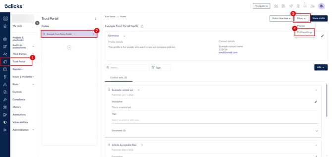 انتقل إلى Trust Portal واختر الملف الذي تريد تعيين أعضاء الوصول له. انقر على المزيد > إعدادات الملف.