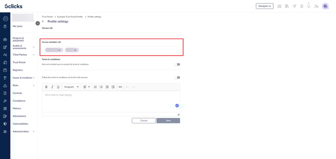 - يمكن للمستخدمين (غير المسؤولين) رؤية والوصول إلى ملف عندما يتم إضافتهم إلى قائمة أعضاء الوصول الخاصة به، أو إذا كان لديهم إذن عرض جميع ملفات Trust portal مُفعل.