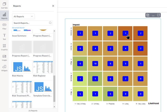 للبدء، قم بسحب وإفلات تقرير مصفوفة المخاطر في لوحة المعلومات.