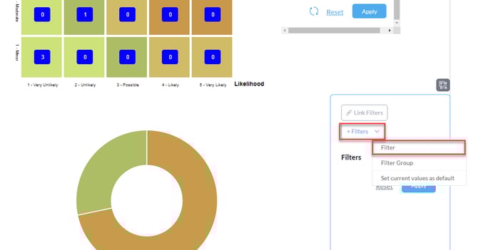 تعد لوحات المعلومات وسيلة فعالة لعرض عدة تقارير في صفحة واحدة. على سبيل المثال، يمكنك إنشاء لوحة معلومات عن طريق دمج التقارير والجداول المتعلقة بنفس الوحدة، مثل دمج مصفوفة المخاطر مع جدول خطة معالجة المخاطر لبناء لوحة معلومات شاملة لمدير المخاطر. وبما أن التقارير لنفس الوحدة عادةً ما تشترك في مرشحات متشابهة وتدعم لوحة المعلومات مرشحًا واحدًا في كل مرة، فإن دمج هذه المرشحات يصبح أمرًا بسيطًا.