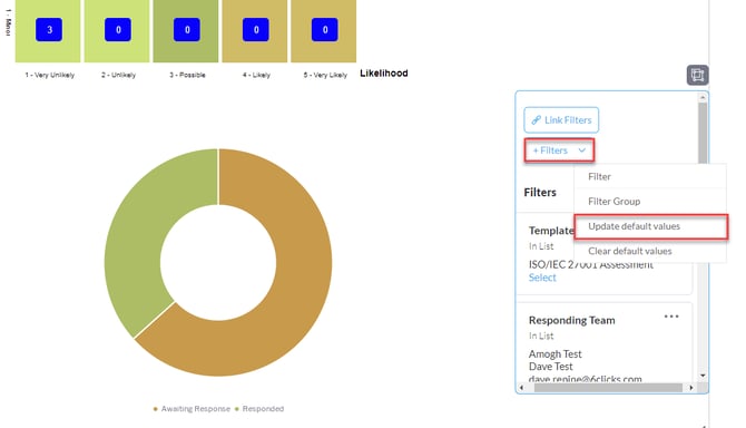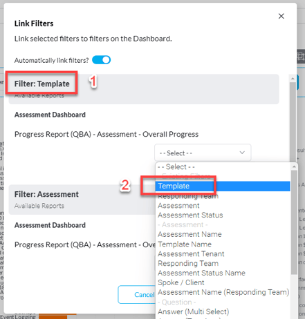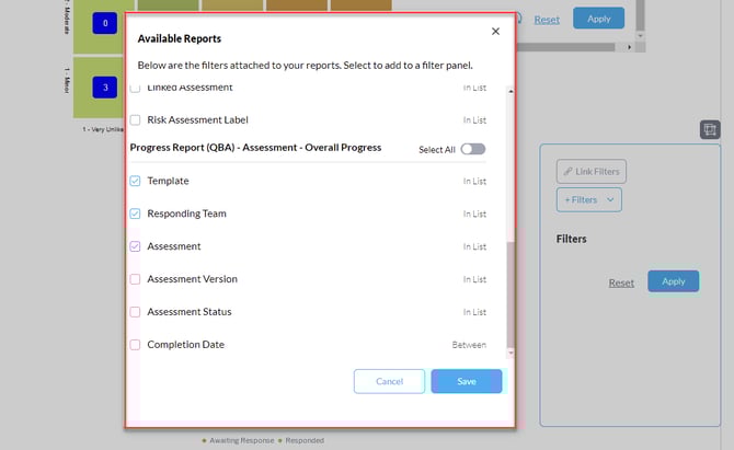 إذا كان لديك تقرير ثالث (في هذا المثال، استخدمنا نتائج التقييم (التقييم القائم على الأسئلة) - حسب المخاطر)، في نافذة ربط المرشحات ستظهر لك إمكانية اختيار مرشحات التقرير لربطها بالمرشحات المستخدمة في لوحة المعلومات (من التقرير الأول).