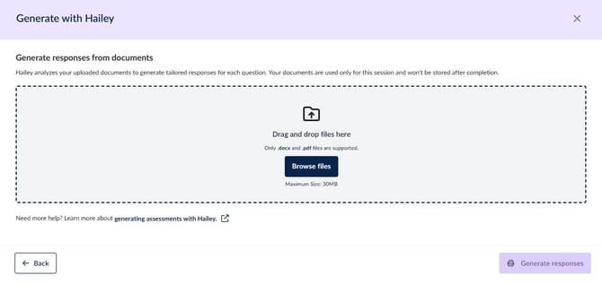 لمساعدة في توليد إجابات دقيقة، يمكنك رفع وثيقة ذات صلة. سيستخدم Hailey محتوى الوثيقة لملء الردود.