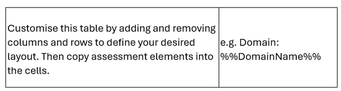 استخدم الجدول المنسوخ من اختيار نوع الجدول > مخصص كما هو موضح أدناه؛ لا تقم بإنشاء جدولك الخاص من الصفر في Word وإلا سيتم بناء التقرير مع أخطاء.