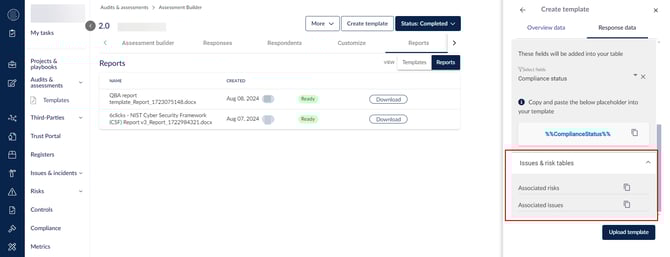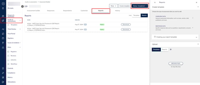 يمكنك استخدام مولد تقارير التقييمات من 6clicks لإنشاء وتخصيص قوالب التقارير بصيغة .DOCX. بعد رفع القالب إلى تقييم 6clicks المكتمل، يمكنك توليد تقرير بصيغة .DOCX يحتوي على بيانات التقييم وتنزيله.