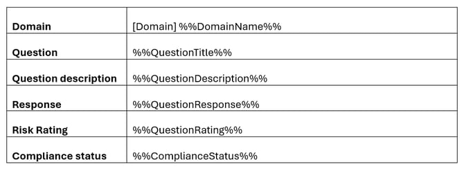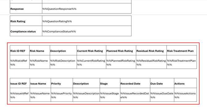 يمكنك نسخ جداول المشكلات والمخاطر أسفل جدول الأسئلة. ستقوم هذه الجداول بتعبئة التقرير بأي مشكلات أو مخاطر مرتبطة بالردود.