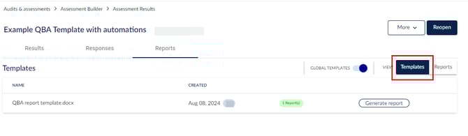 يستخدم مفتاح القوالب العالمية لإظهار/إخفاء قوالب التقارير المرتبطة بـ قوالب التقييم من مكتبة المحتوى.