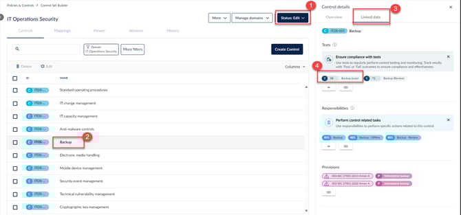 لعرض الاختبارات ضمن مجموعة ضوابط محددة والتي تم ربطها مع Wiz وأتمتتها، انقر على الضابط وانتقل إلى البيانات المرتبطة. تشير الرموز إلى ما إذا كان الاختبار قد تم أتمتته مع Wiz وسيتم استرجاع النتائج تلقائيًا كل ٢٤ ساعة أو إذا تم إعداده يدويًا.