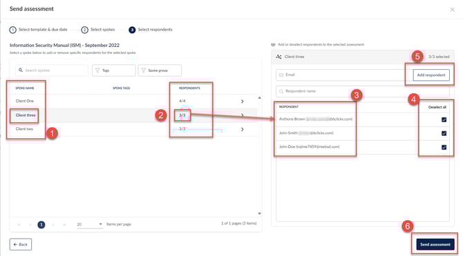 إذا كنت ترغب في إضافة مستجيبين إضافيين من الـ Spoke لهذا التقييم، يمكنك القيام بذلك عن طريق تحديدهم ببساطة عبر مربع الحوار هذا. يمكنك أيضًا إضافة مستجيب للتقييم بشكل ديناميكي وسيتم إضافته كمستجيب في الـ Spoke. سيتم تعيين المستجيبين المُعينين فردياً على جميع الأسئلة في التقييم ومنحهم صلاحية السماح بالتقديم بشكل افتراضي.