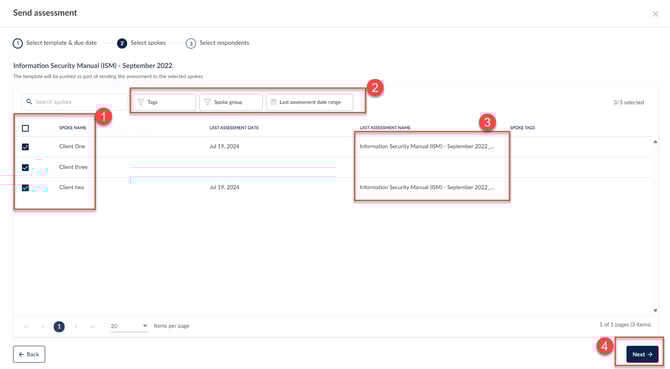 سيظهر لك مربع حوار يظهر فيه قائمة الـ Spokes التي لديك صلاحية الوصول إليها والتي يمكنك إرسال نموذج التقييم إليها. من هذه الشاشة، يمكنك استخدام عوامل التصفية مثل العلامة، مجموعة الـ Spokes، أو نطاق تاريخ آخر تقييم، واختيار الـ Spokes التي تنوي إرسال نموذج التقييم إليها ثم النقر على إرسال.