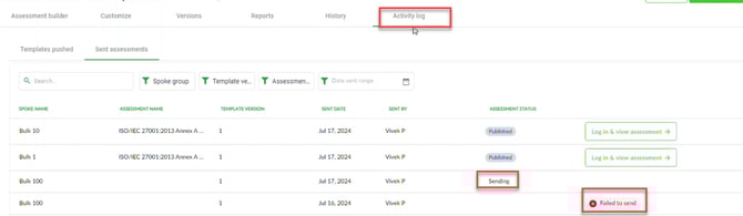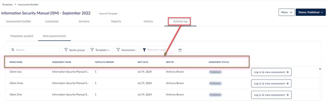 يلخص سجل الأنشطة جميع تفاصيل نموذج التقييم، بما في ذلك، في قسم التقييمات المُرسلة، العملاء الذين استلموا التقييم، واسم وإصدار التقييم، والتاريخ والمرسل، وحالة التقييم.