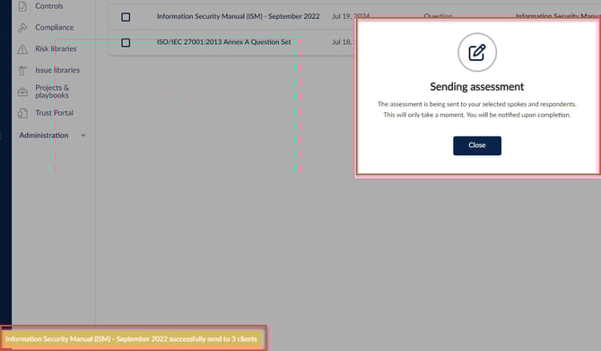 بعد الضغط على إرسال التقييم، ستظهر لك نافذة منبثقة تؤكد أنه يتم إرسال تقييمك وأنك ستتلقى إشعاراً عند اكتماله. كما سترى في الزاوية السفلية اليمنى اسم التقييم الذي تم إرساله وعدد العملاء الذين سيتلقونه.