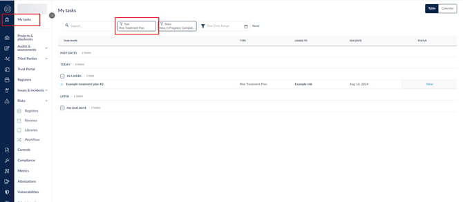 يمكنك استخدام وظائف التصفية والبحث للعثور على خطة معالجة المخاطر الخاصة بك. في هذا المثال، قمنا بالتصنيف حسب النوع.