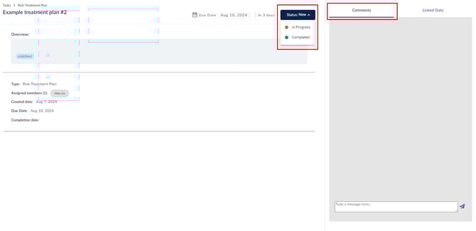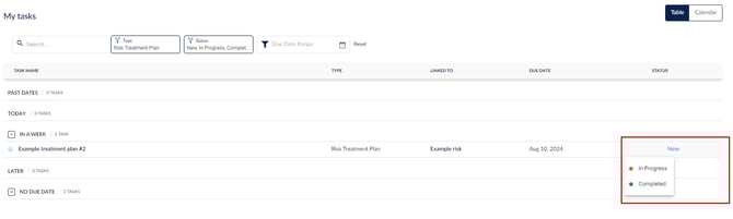 يمكنك تغيير حالة خطة معالجة المخاطر من "جديدة" إلى "قيد التنفيذ" أو "مكتملة" عن طريق النقر على الحالة المناسبة سواء من داخل خطة المعالجة أو من قائمة مهامك.