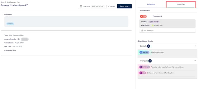 لمزيد من التفاصيل حول خطة معالجة المخاطر، انقر على اسمها. إذا كانت لديك الصلاحيات اللازمة، يمكنك رؤية المخاطر المرتبطة بها من خلال النقر على البيانات المرتبطة في اللوحة الجانبية.