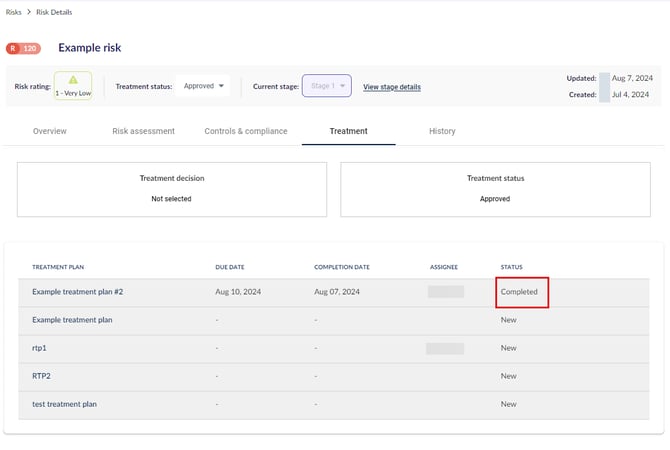 إذا كنت تقوم بإكمال خطة معالجة مخاطر من داخل سجل المخاطر، فستكون قد انتقلت إلى وحدة المخاطر/السجلات، قمت بتحديد المخاطرة، ثم نقرت على جدول المعالجة، واخترت خطة معالجة المخاطر للتحديث. راجع هذه المقالة المرتبطة للحصول على نظرة عامة على سير عمل خطة معالجة المخاطر.