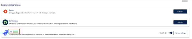 لتفعيل أو تعطيل تكامل Jira مؤقتًا، يمكنك تبديل المفتاح الموجود تحت الإدارة > التكاملات > Jira.