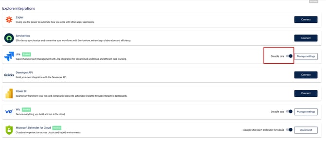 يرجى الملاحظة أن فصل Jira سيؤدي إلى حذف التكامل وإزالة جميع مشكلات Jira المرتبطة من 6clicks – وهذه العملية لا يمكن التراجع عنها. لتعطيل Jira مؤقتًا، اتبع الخطوات المذكورة أعلاه.