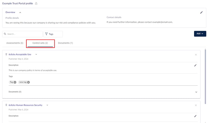 تم تصميم Trust Portal لتسهيل مشاركة معلومات المخاطر والامتثال الخاصة بك، مثل مجموعات الضوابط الموجودة في 6clicks، مع أي شخص يحتاج إلى الاطلاع عليها.