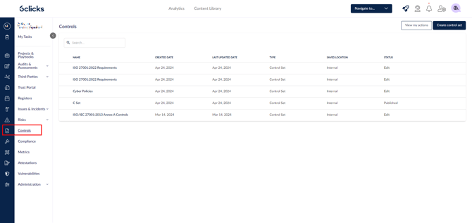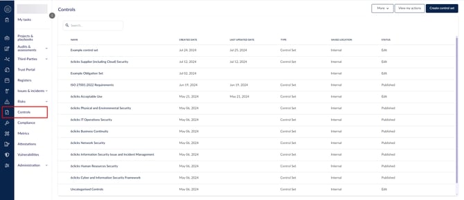 للوصول إلى مجموعات الضوابط الخاصة بك، اختر Controls من قائمة التنقل. سيفتح ذلك صفحة الضوابط، التي تعرض جميع مجموعات الضوابط الخاصة بمؤسستك المخزنة في 6clicks. يمكنك فرز مجموعات الضوابط حسب تاريخ الإنشاء أو تاريخ التحديث الأخير.