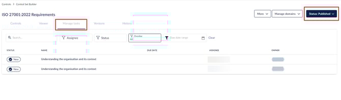 عندما تصبح مجموعة الضوابط منشورة، قد تحتوي أيضًا على علامة التبويب إدارة المهام؛ يظهر ذلك لمالكي مجموعة الضوابط ويوفر نظرة عامة على جميع المهام داخل المجموعة.