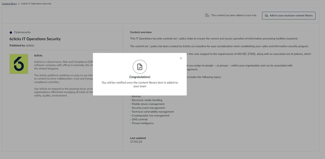 يسمح إنشاء ومشاركة أو حتى استخدام مجموعات الضوابط من مكتبة محتوى 6clicks لمؤسستك بإدارة أطر الامتثال بشكل أفضل، وتبسيط عمليات تقييم المخاطر، وتعزيز الحوكمة الشاملة من خلال ضمان التطبيق المتسق والفعال للمعايير.