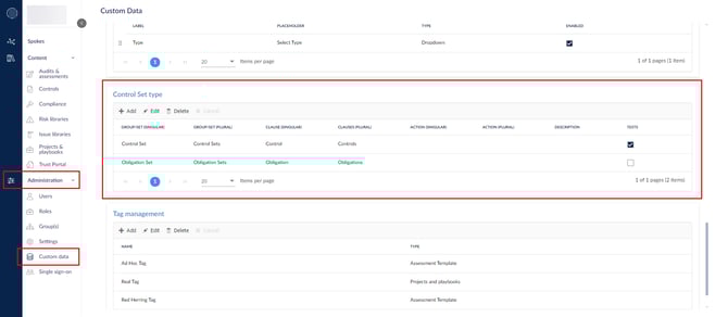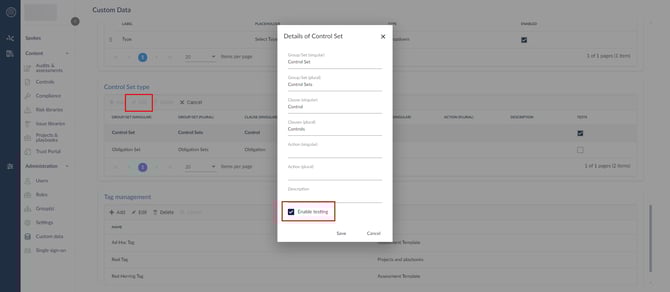 أولاً، تأكد من تفعيل الاختبارات لنوع مجموعة الضوابط التي تريد إضافة الاختبارات إليها. للقيام بذلك، انتقل إلى الإدارة > البيانات المخصصة وابحث عن جدول نوع مجموعة الضوابط.