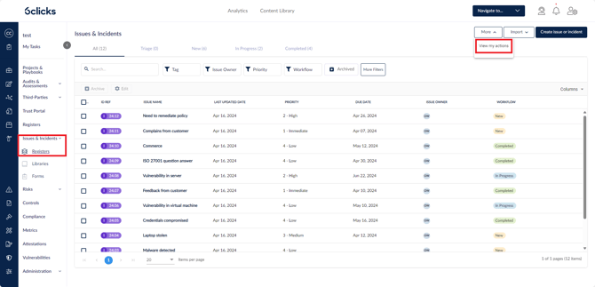 اختر المشكلات والحوادث > السجلات، ثم المزيد > عرض مهامي في أعلى اليمين.