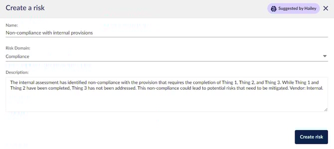 يمكنك اختيار أحد المخاطر التي يوصي بها Hailey من سجلات المخاطر الخاصة بك، أو طلب من Hailey إنشاء خطر يتناسب مع المتطلب، أو إنشاء/ربط خطر بنفسك.