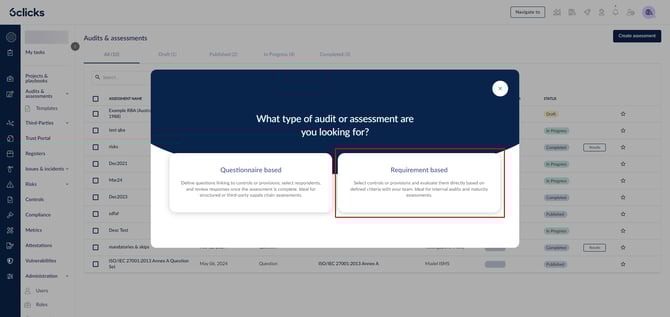 يمكنك أيضاً إنشاء تقييم قائم على المتطلبات (RBA) استناداً إلى قالب، أو تقييم سابق، أو قالب مُضاف من مكتبة محتويات 6clicks.