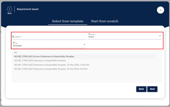 في علامة التبويب الاختيار من القالب، ابحث عن القالب أو التقييم السابق الذي ترغب في استناد تقييمك عليه باستخدام شريط البحث أو عوامل التصفية. انقر على التالي للمتابعة.