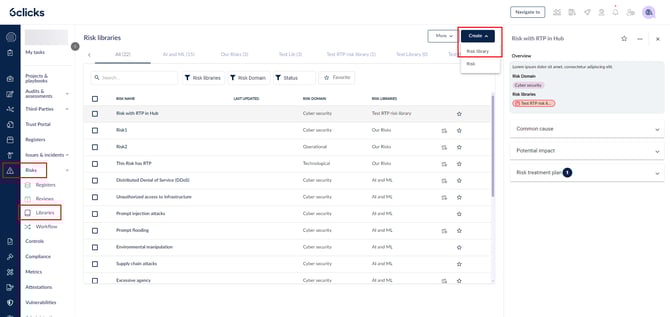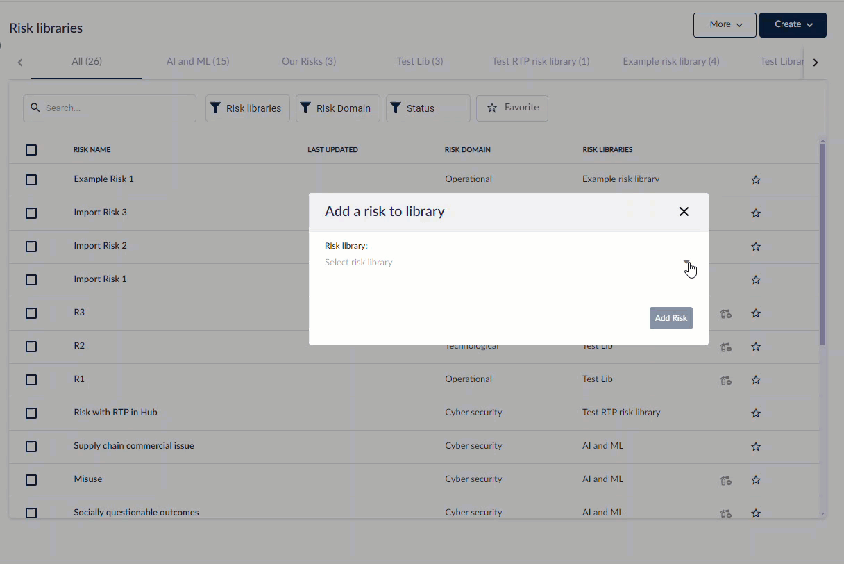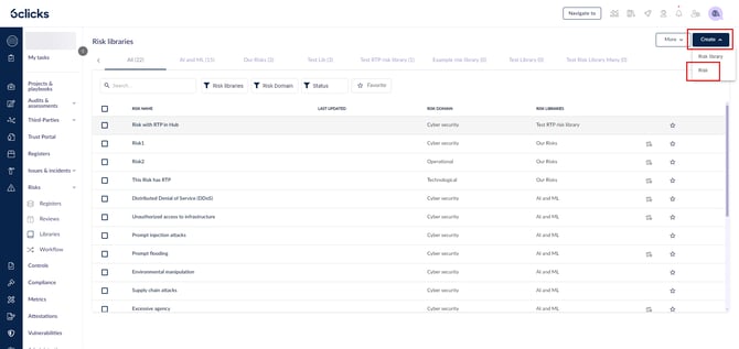 انتقل إلى المخاطر > المكتبات. انقر على إنشاء واختر مكتبة مخاطر لإنشاء مكتبة مخاطر جديدة.