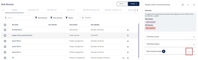 ارجع إلى لوحة تفاصيل الخطر الجانبية بالنقر على الخطر مرة أخرى أو السهم الخلفي في أعلى اللوحة الجانبية، وقم بتوسيع قسم خطة معالجة المخاطر لرؤية خطط المعالجة المرتبطة بالخطر.