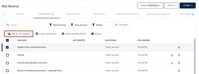 اختر المخاطر التي تريد إضافتها إلى مكتبة أخرى واختر إضافة إلى المكتبة القائمة في أعلى الجدول.