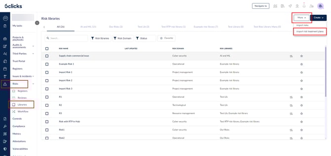 في مكتبات المخاطر، انقر على المزيد > استيراد خطط معالجة المخاطر.