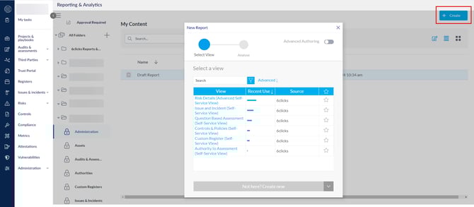 انتقل إلى وحدة التحليلات وانقر على + إنشاء > تقرير. اختر العرض الخاص بالخدمة الذاتية الذي يتعلق بالبيانات التي ترغب في إعداد تقرير عنها.