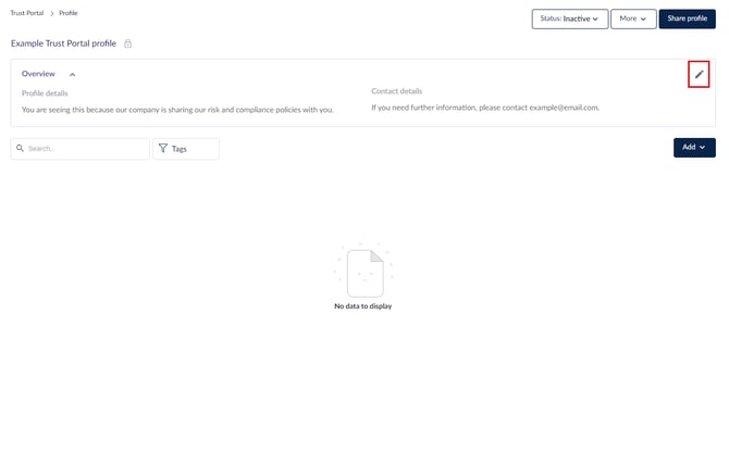 يتيح لك Trust Portal مشاركة معلومات الشركة والمنتجات، نتائج التقييمات (مثل ISO 27001)، مجموعات الضوابط، وأي وثائق داعمة.