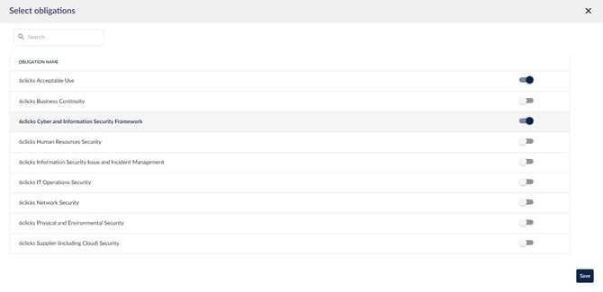 اختر مجموعات الضوابط، ثم انقر على + تحت عنوان مجموعات الضوابط. ابحث عن مجموعات الضوابط باستخدام وظيفة البحث إذا لزم الأمر. حدد مجموعات الضوابط باستخدام مفاتيح التبديل وانقر على حفظ.