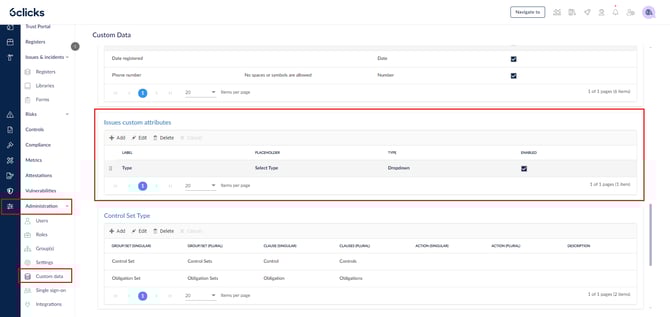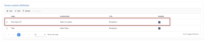 لإنشاء الحقول المخصصة للمشكلات، اختر الإدارة > البيانات المخصصة من لوحة التنقل اليسرى. هنا يمكنك رؤية جدول سمات المشكلات المخصصة. بشكل افتراضي، يكون هذا الجدول فارغًا باستثناء النوع. لا يمكن حذف أو تعديل هذا الحقل.