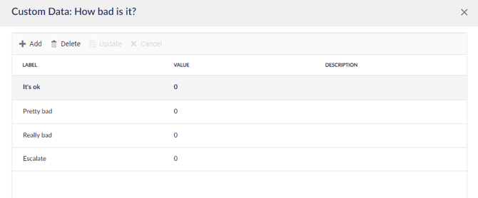 أضف العدد المطلوب من الخيارات. يمكنك أيضًا حذف القيم بتحديدها والضغط على حذف. لتحرير قيمة، انقر نقرًا مزدوجًا عليها. للخروج، اضغط زر الإغلاق في أعلى يمين النموذج.