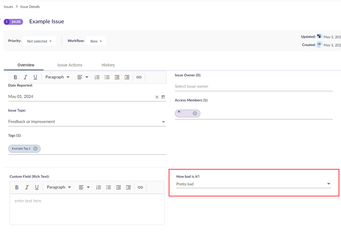 ستظهر الحقول المخصصة أسفل الحقول الافتراضية في علامة تبويب نظرة عامة للمشكلة.