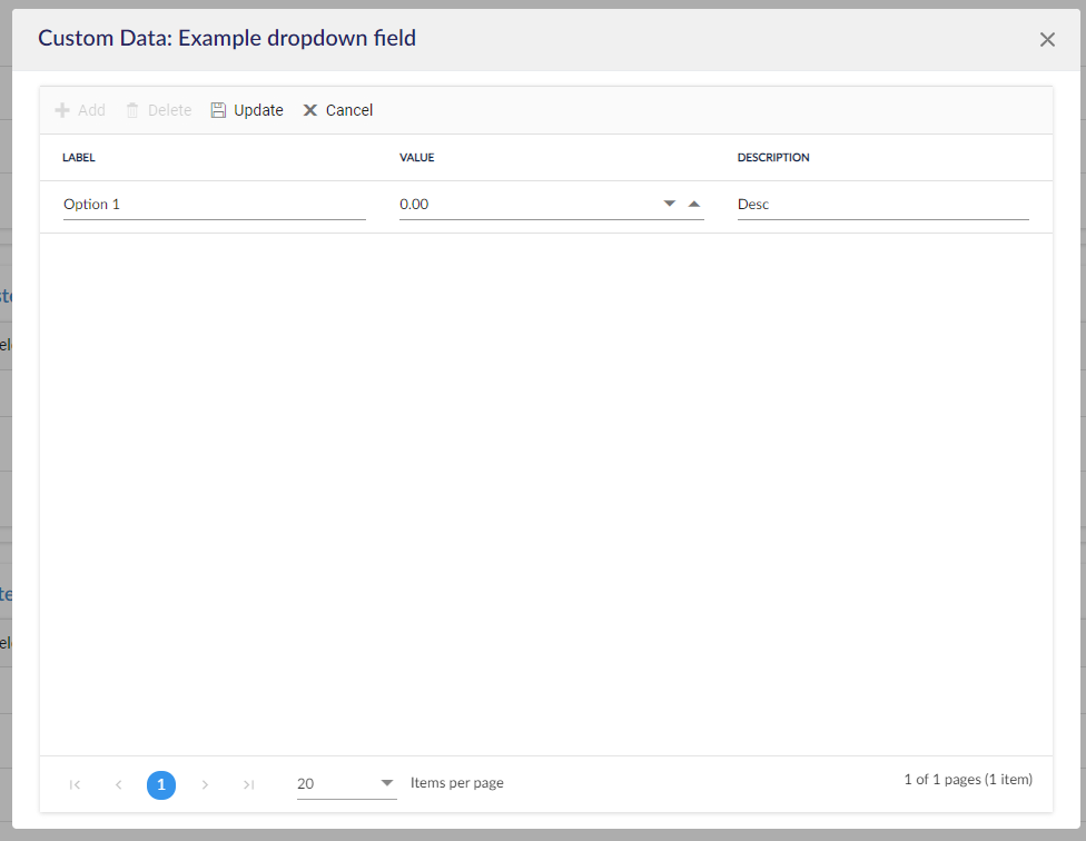 ستظهر صف في الجدول، حيث يمكنك إضافة اسم الخيار، وقيمة (اختيارية)، ووصف (اختياري). انقر على تحديث أو اضغط Enter على لوحة المفاتيح للتأكيد.