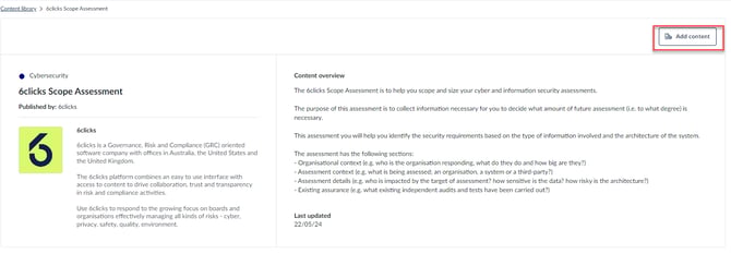 - من مكتبة المحتوى، استخدم شريط البحث للعثور على تقييم نطاق 6clicks وعرض تفاصيله.
