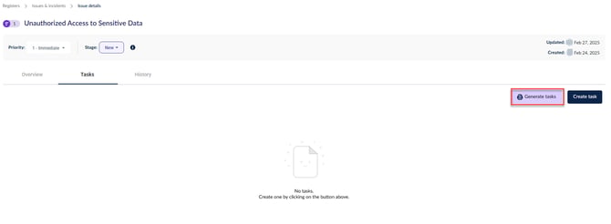تساعد ميزة توليد مهام Hailey AI المستخدمين في إدارة المشكلات والحوادث من خلال توليد مهام تصحيحية ذات صلة استنادًا إلى معايير معترف بها مثل ISO/IEC 27001:2022 Annex A.