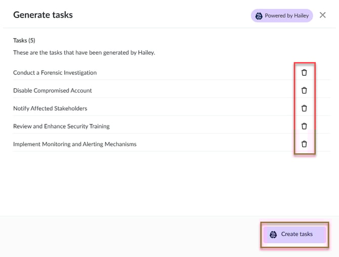 Hailey AI ستستغرق بضع ثوانٍ لتوليد قائمة بالمهام التصحيحية ذات الصلة بالمشكلة أو الحادث. إذا كانت أي من المهام في الجدول غير ذات صلة، يمكنك حذفها بالنقر على أيقونة سلة المهملات. بمجرد رضاك عن القائمة، انقر على إنشاء المهام.